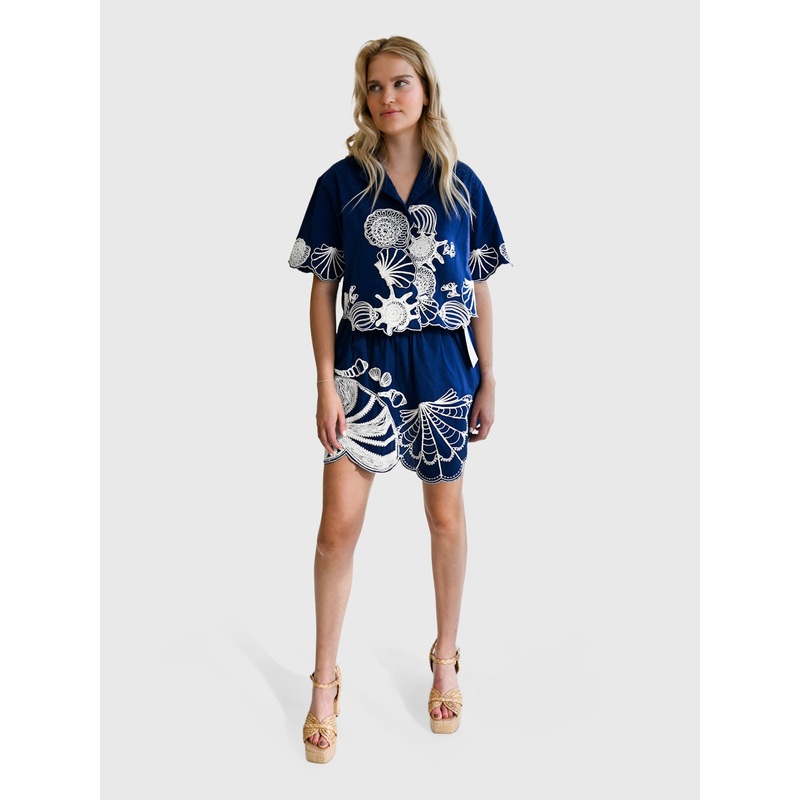This flattering and fun blouse is made from lightweight fabric and features a nautical-inspired embroidered shell motif.