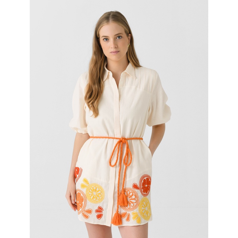 DESCRIPTION:This elevated shirtdress is made from lightweight fabric and features puff sleeves, a self-tie belt, and fun, embroidered citrus motifs.FEATURES:Spread CollarPuff SleevesHidden Button-Down FrontSelf-Tie BeltEmbroidered DesignsMini SilhouetteLig