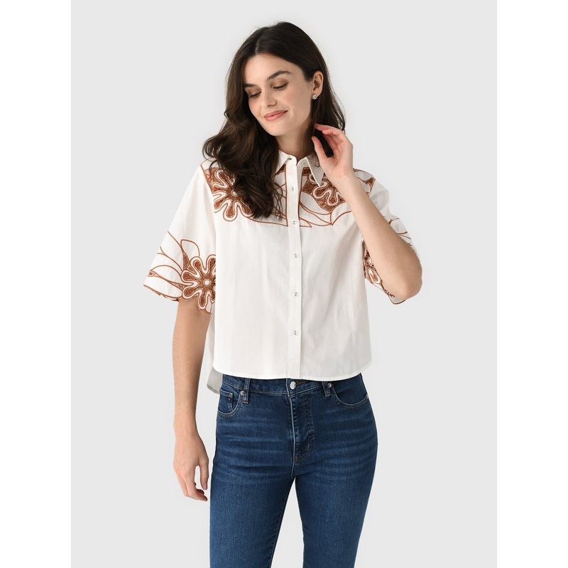 DESCRIPTION:This lightweight button-down blouse features a flattering design and intricate, swirling embroidery at the yoke and sleeves.FEATURES:Spread CollarShort SleevesButton-Down FrontShirttail HemEmbroidered DesignsLightweight FabricationClassic FitMo