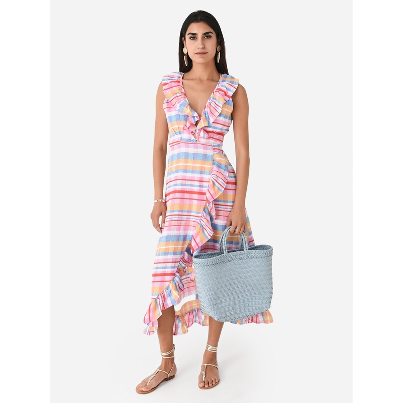 Colorful plaid wrap-style dress with a high-low hem and ruffle trim.
