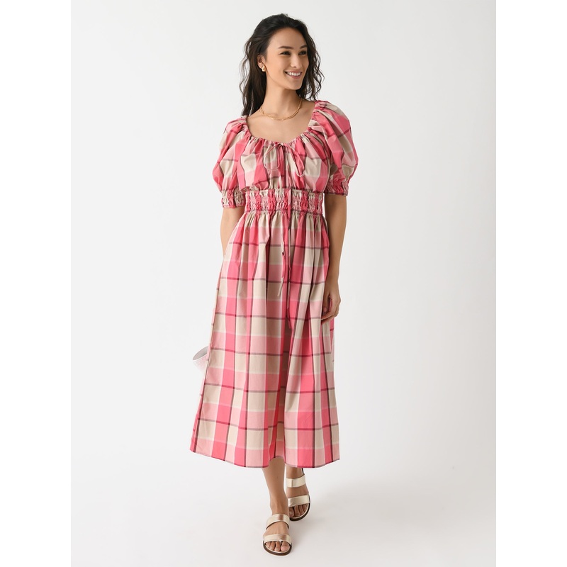 A mid-length dress with puff sleeves, a smocked waist, and a large plaid print.