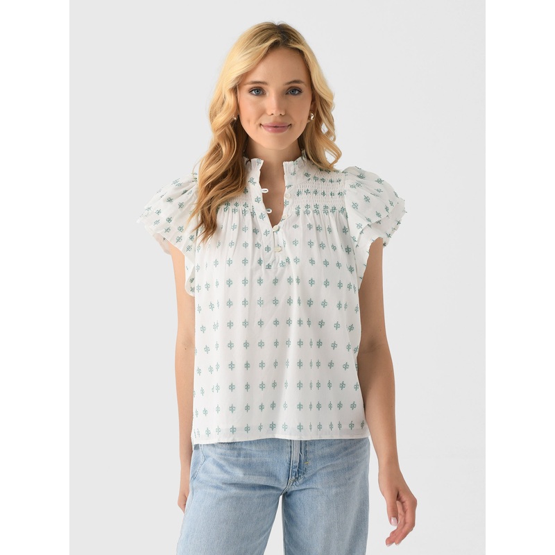 DESCRIPTION:Lightweight top with a ruffle collar, smocked back, and ruffle sleeves.FEATURES:Ruffle CollarPartial Button PlacketRuffle SleeveSmocked YokeLightweight FabricationRelaxed FitModel is wearing size Small top. Crosshatch: Model's Measurements: Hei