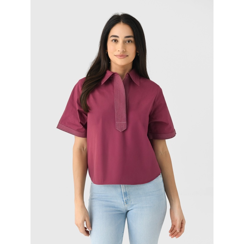 DESCRIPTION:A modern essential designed for style and comfort. This top is made from a lightweight, breathable fabric and features a deep V-neckline. The contrast stitching at the placket and sleeves provides a striking visual pop, making it a standout pie