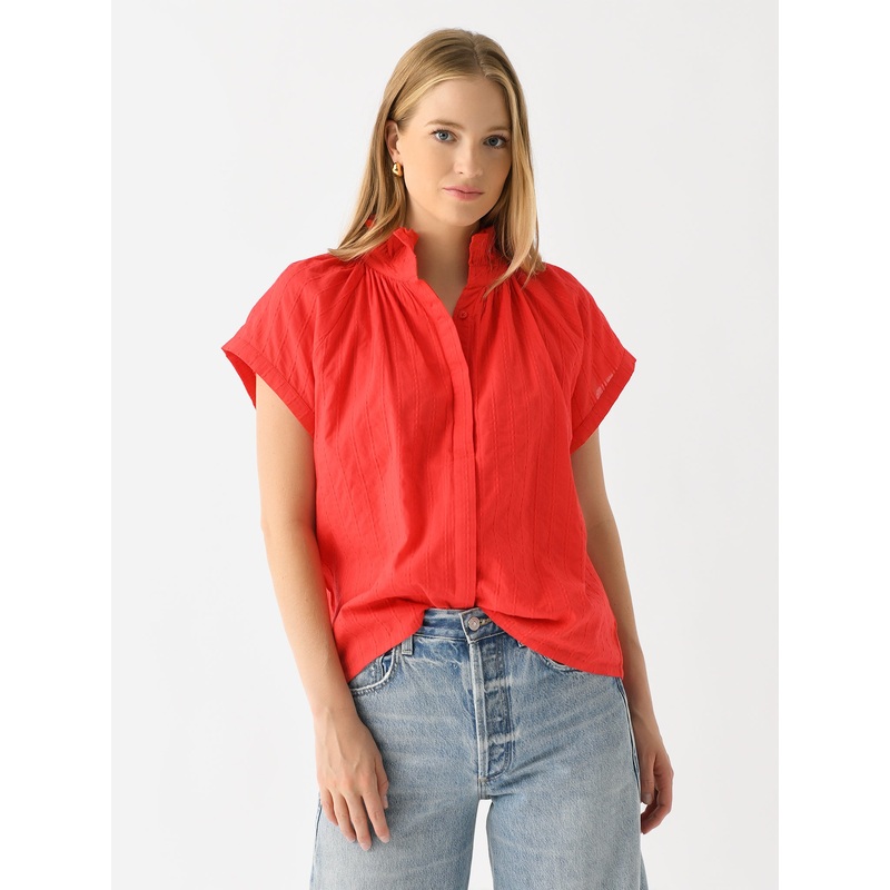 DESCRIPTION:An everyday top made from lightweight cotton with a hidden button-down placket.FEATURES:Ruffle NecklineHidden PlacketStraight Hem100% CottonClassic FitModel is wearing size Small top.Model's Measurements: Height: 5'9.5" | Bust: 32C | Waist: 26.