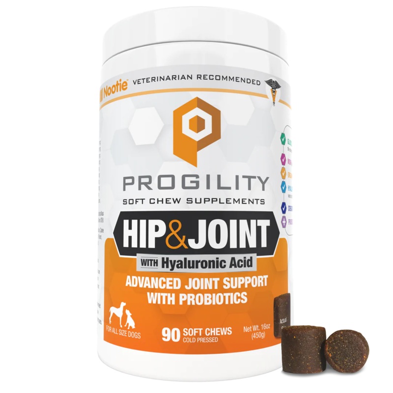 Progility Hip & Joint Soft Chew SupplementsKey Benefits:Glucosamine & Chondroitin work together to support cartilage & joint health by helping to slow down the deterioration of joint tissue.MSM (Methylsulfonylmethane) helps relieve joint pain and inflammat