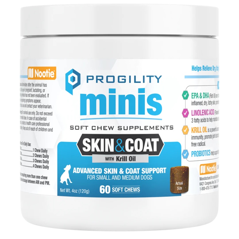 Progility Minis Skin & Coat Soft Chew SupplementFor Small & Medium Size DogsPromotes Healthy Skin and a Soft Coat - 60 Soft ChewsIngredients:Rice Bran, Tapioca Starch, Purified Water, Sunflower Lecithin, Natural Cheddar Cheese Flavor, Fish Oil, Glycerin (P