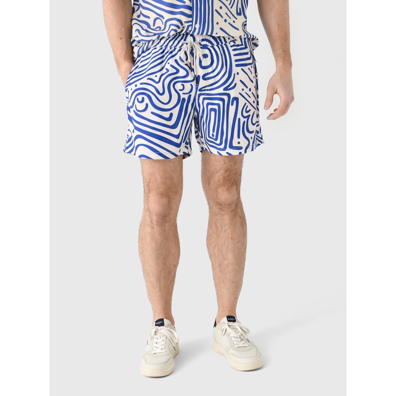 This quick-drying swim trunk is made from brushed fabric and features a custom hand-drawn pattern.