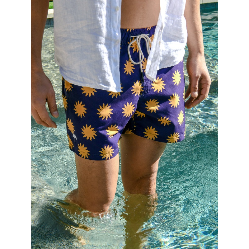 Breathable swim trunk with a soft peached finish and vibrant sun print.