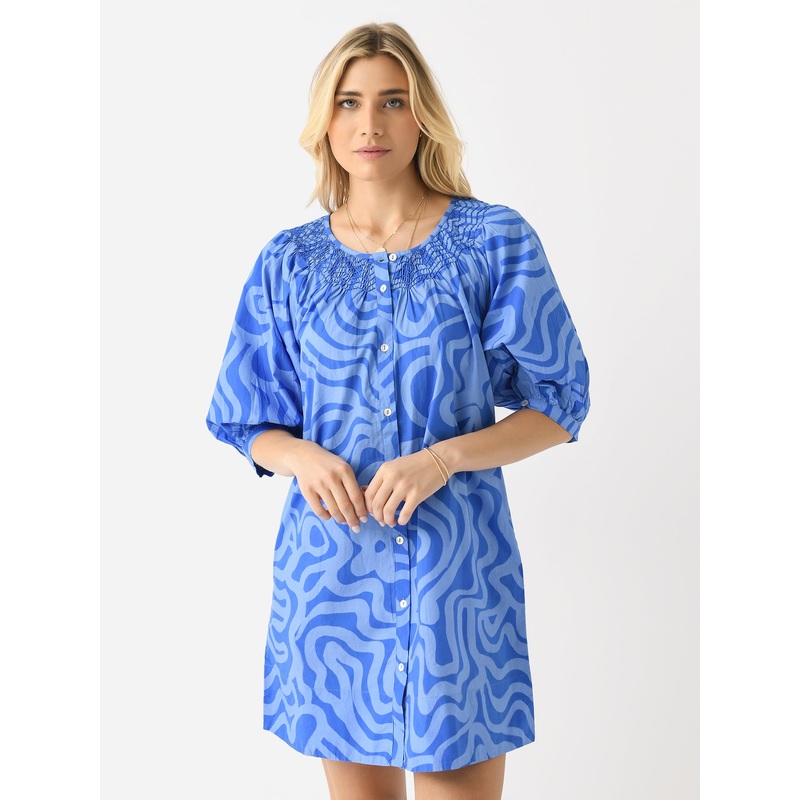 DESCRIPTION:A casual mini dress made from lightly structured cotton poplin with a hand-sewn embroidered neckline and half-length puff sleeves.FEATURES:Embroidered NecklineHalf-Length Puff SleevesButton-Down FrontSide PocketsMini SilhouetteAll-Over Novelty