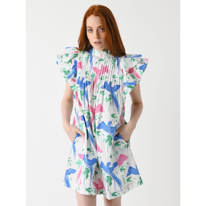 DESCRIPTION:This soft-structured mini dress is made from lightweight cotton poplin and features ruffle sleeves and a pintucked bodice.FEATURES:Ruffle CollarBack Button ClosurePintuck YokeFlutter SleevesMini SilhouetteAll-Over Novelty Print100% Cotton Popli