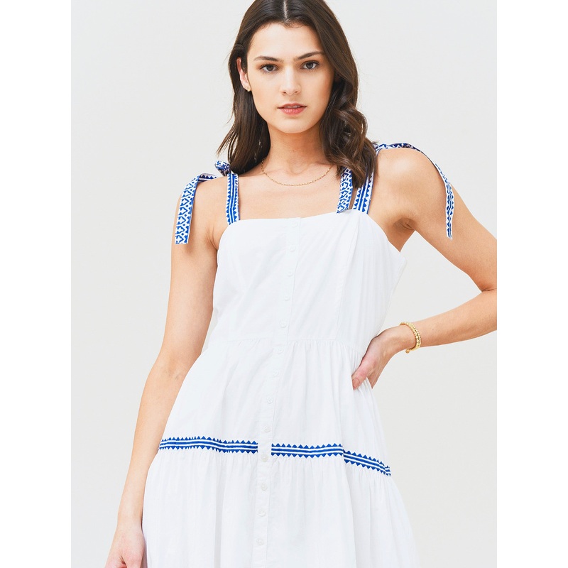 DESCRIPTION:Midi length dress with a button-down placket and tie shoulder straps.FEATURES:Midi DressSquare NecklineTie Shoulder StrapsButton-Down PlacketNovelty PrintLined100% CottonModel is wearing size Small midi dress.Model's Measurements: Height: 5'9.5