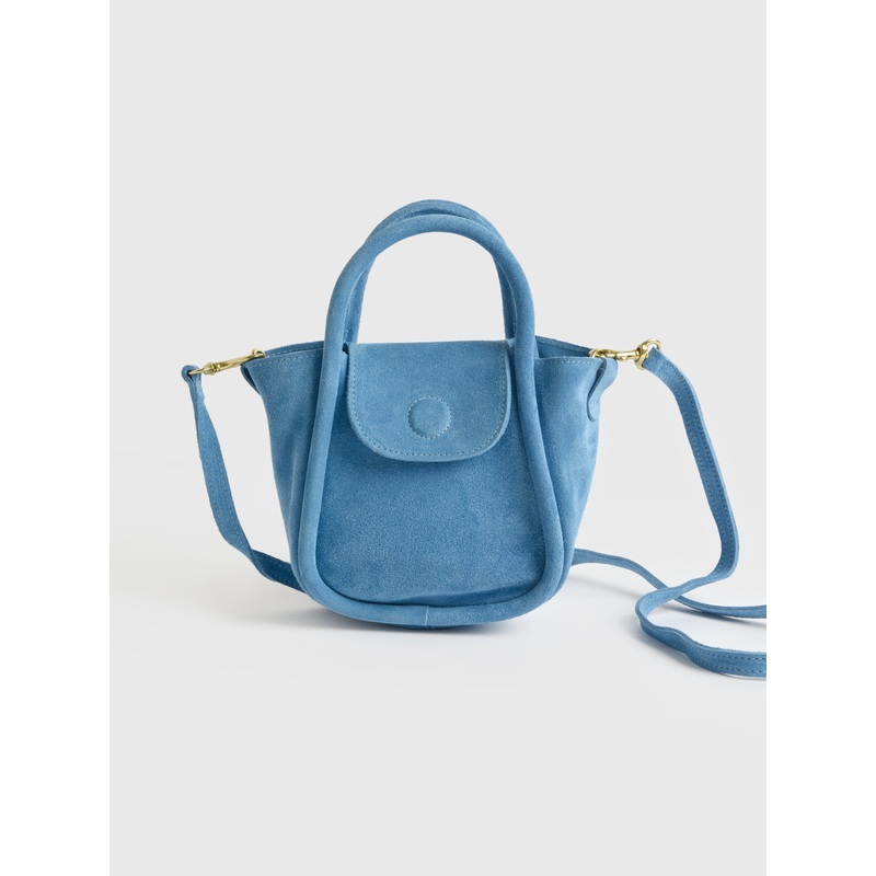 Soft suede crossbody bag featuring a detachable strap and compactable design.