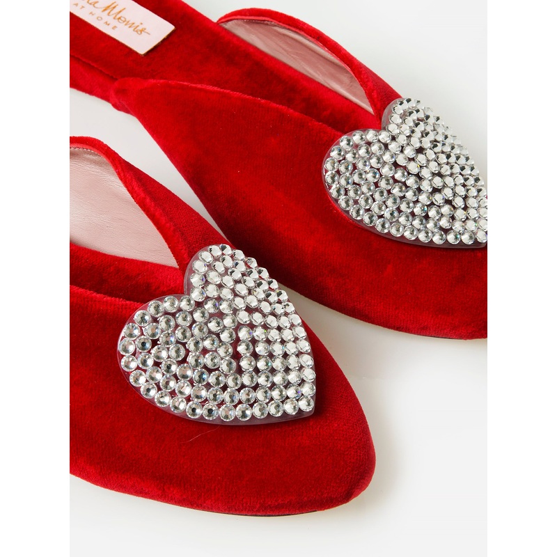 DESCRIPTION:Velvet wedge slipper with a crystal-embellished heart detail and brushed leather sole, also suitable for outdoor wear.FEATURES:FlatPointed ToeCrystal-Embellished Heart DetailLeather LiningMemory Foam FootbedBrushed Leather SoleCotton Velvet Con