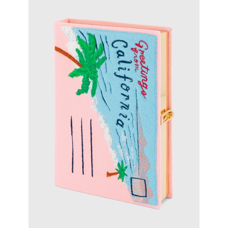 This charming clutch handbag is designed to look like a book. It features a felt appliqu that is embroidered to resemble a vintage-inspired postcard, making it a playful and unique accessory.