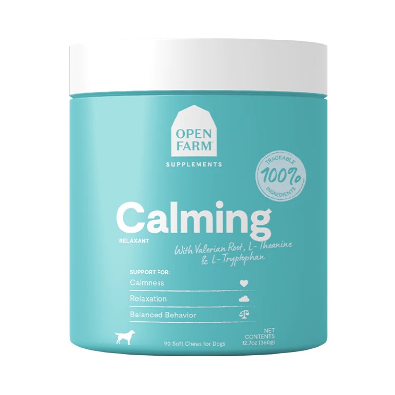 Open FarmCalming Supplement Chews for DogsFrom separation anxiety to scary car rides, our delicious Calming chews were formulated to help promote calmness and reduce anxiousness using only 100% traceable and vet-recommended functional ingredients.90 soft c