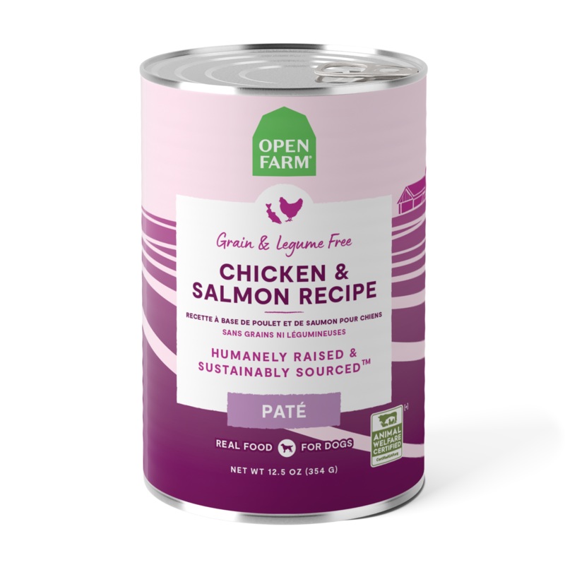 Open Farm Chicken & Salmon Pate for DogsThis complete and balanced pt recipe features G.A.P. certified, humanely raised chicken and Ocean Wise certified, wild-caught salmon. In addition, chicken liver and non-GMO vegetables such as sweet potatoes, carrots