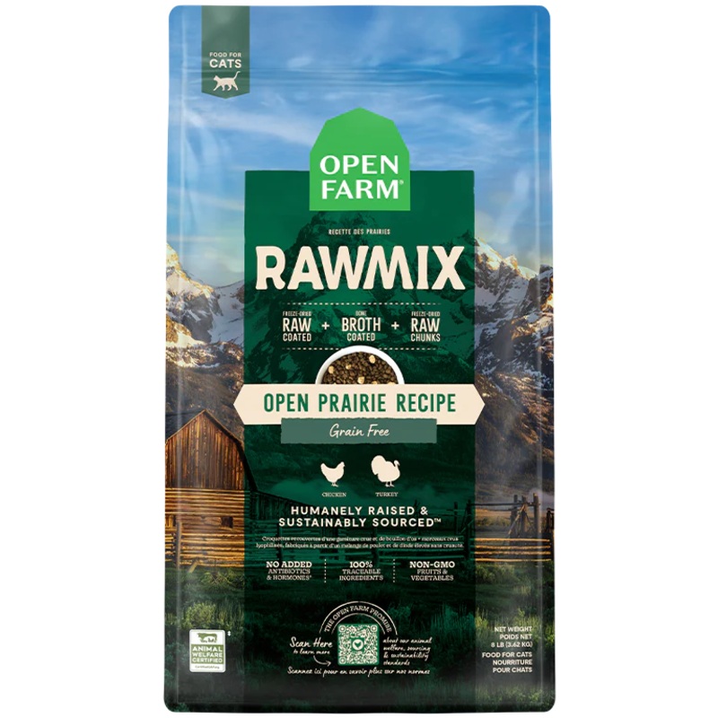 Open Prairie Grain-Free RawMix for CatsRawMix features protein-packed kibble covered in a nutritious bone broth and freeze dried raw coating, with added chunks of freeze dried raw. Crafted with a blend of 100% animal welfare certified chicken and turkey, t