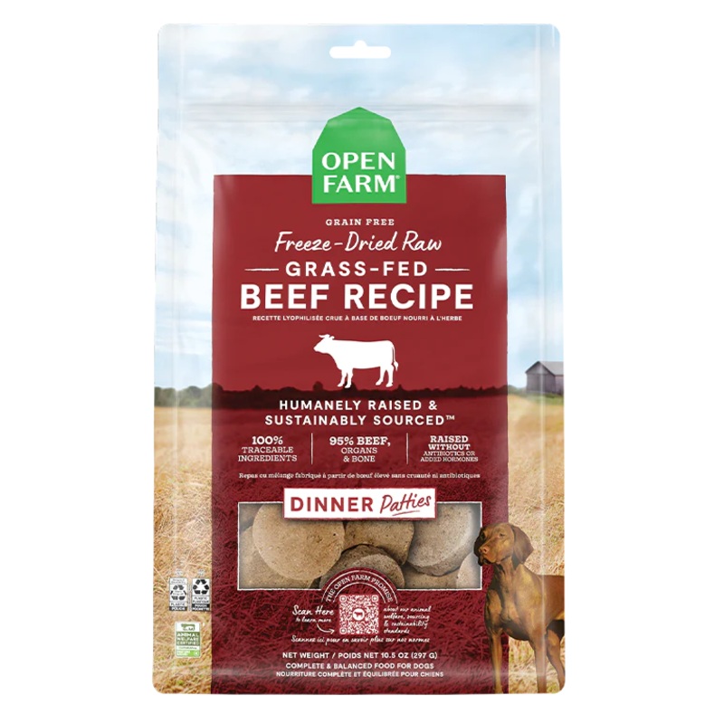 The most convenient way to feed your dog a real raw diet, this single animal protein recipe provides a delicious complete and balanced meal. Our grass-fed beef recipe contains 95% grass-fed beef, beef organ and calcium rich beef bone. Open Farm beef patties are a true prey-model diet your dog wont be able to resist.