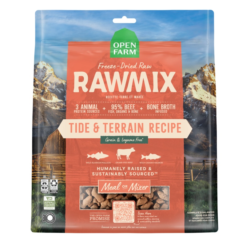 Open Farm RawMix Freeze Dried Morsels Tide & Terrain Recipe100% HUMANELY RAISED AND SUSTAINABLY SOURCED FISH & MEAT100% TRACEABLE INGREDIENTS100% NON-GMO GRAINS, FRUITS & VEGETABLESRAISED WITHOUT ANTIBIOTICS, HORMONES OR STEROIDS+ ALL RECIPES ARE 95% MEAT,