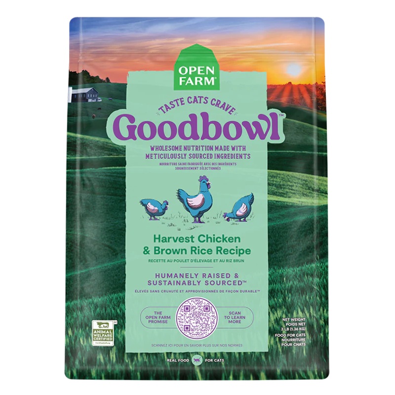 Goodbowl Harvest Chicken & Brown Rice Recipe for CatsThis tasty Goodbowl recipe features wholesome kibble made with meticulously sourced, simple ingredients to provide optimal nutrition to your cat. This recipe is high in protein, made with humanely raised