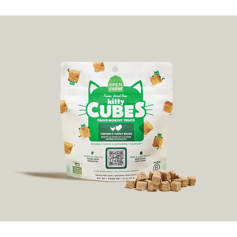 Open Farm Chicken & Turkey Kitty Cube TreatsThese bite-sized treats for cats are freeze dried raw with humanely-raised chicken and turkey to preserve nutrition and crave-worthy flavor. Our first-ever cat treats, Kitty Cubes are enriched with omega fatty ac