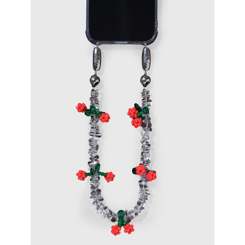 This unique phone wristlet is made with rock crystal gemstones and sweet beaded cherry motifs. It is designed to be used with Ossa phone cases.