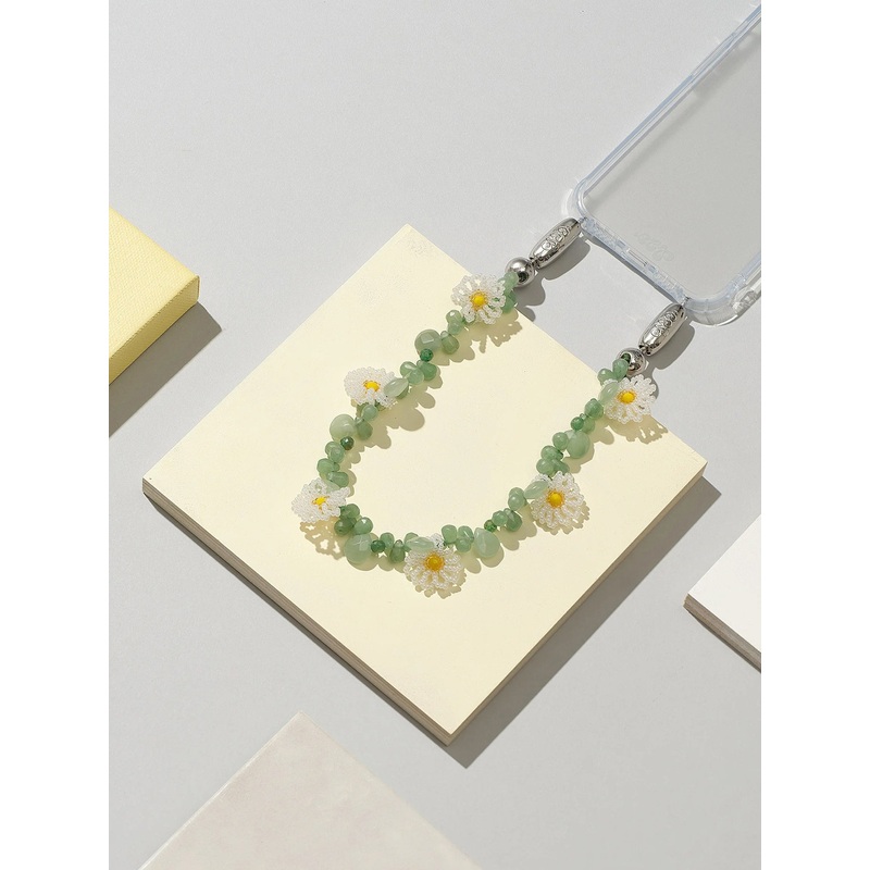 DESCRIPTION:This adorable phone wristlet is made from genuine green aventurine and features beaded daisy details. It is designed to be used with Ossa phone cases.FEATURES:Ball Stud ConnectionNylon CordAventurine Gemstones, BeadsLength: 15 in.Weight: 56g