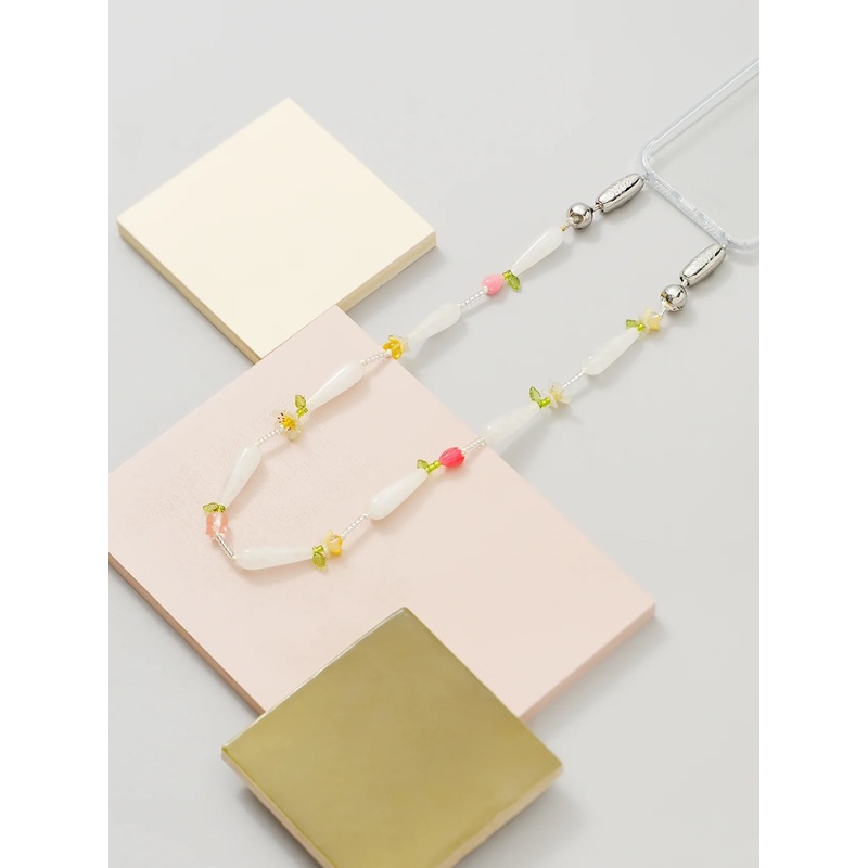 A shoulder-length phone cord made from a durable knotted cord with gemstones and floral glass charms.