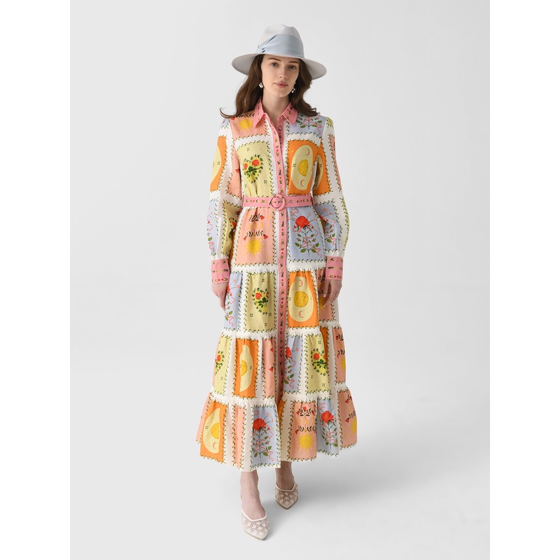 DESCRIPTION:This long-sleeve dress is crafted from premium linen and features a colorful print, a flattering fitted waist, and a long flowy skirt.FEATURES:Spread CollarButton CuffsHidden Button-Down FrontAdjustable BeltSide PocketsTiered SkirtMaxi Silhouet