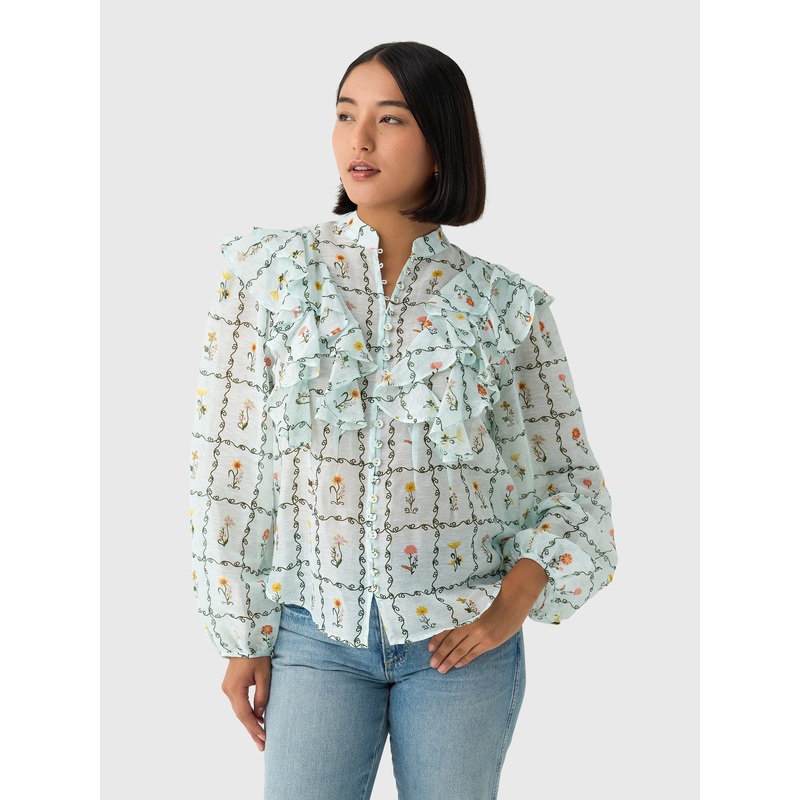 The Suki Blouse is crafted from a premium silk linen blend in an exclusive Calypso Tile print. With a sheer finish, it features blouson sleeves, a button closure, and a double flounce frill for elegant coverage.