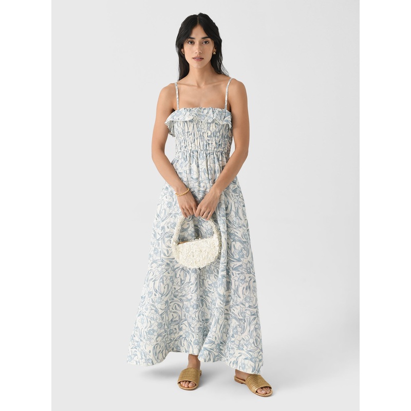 DESCRIPTION:A flattering mid-length dress made from lightweight linen with a smocked bodice and a floral print.FEATURES:Strapless NecklineRuffle TrimSmocked BodiceFull SkirtMidi SilhouetteAll-Over Novelty Print100% LinenClassic FitModel is wearing size Sma