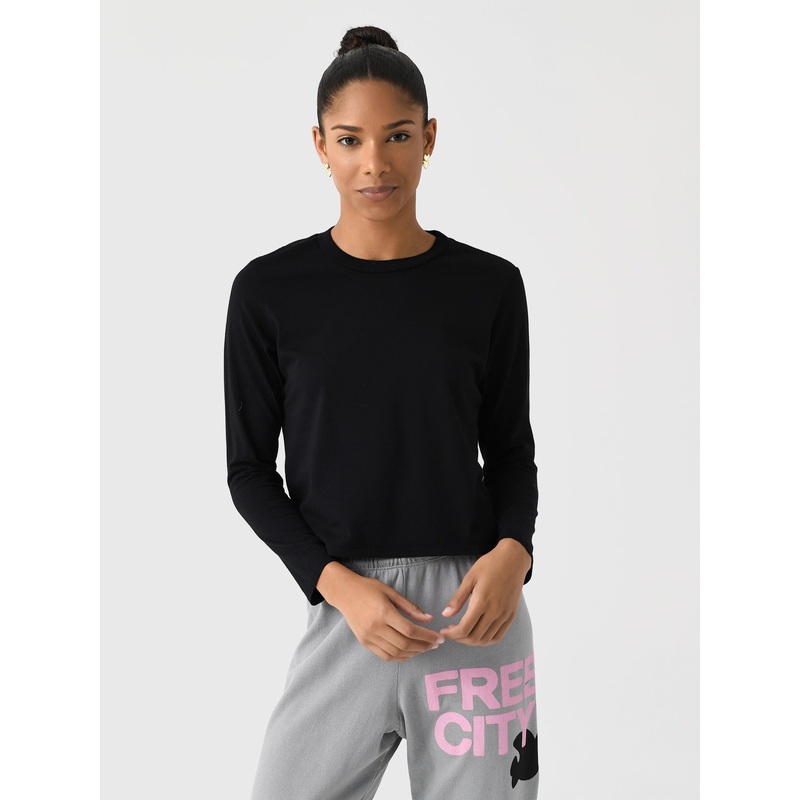 DESCRIPTION:A soft Supima cotton long-sleeve tee with a crew neckline and slightly cropped mid-waist hem.FEATURES:Crew NecklineLong SleevesCropped Silhouette100% Supima CottonClassic FitModel is wearing size Small tee.True Black: Model's Measurements: Heig