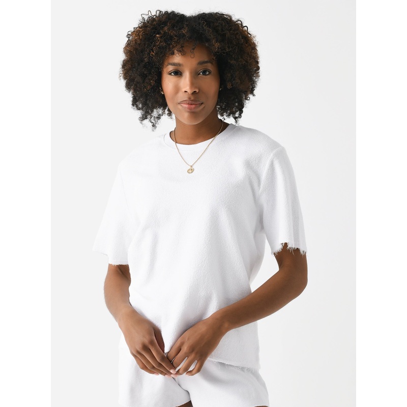 DESCRIPTION:A slightly oversized sweatshirt-style tee made from soft French terry fabric.FEATURES:Crew NecklineRaw Edge TrimsFrench Terry Fabric60% Cotton, 40% RayonRelaxed FitModel is wearing size Small tee.Model's Measurements: Height: 5'10" | Bust: 34B