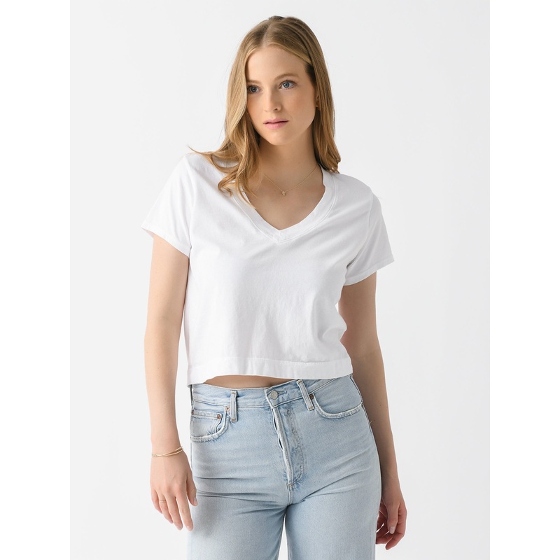 DESCRIPTION:A slightly boxy v-neck tee made from Supima cotton.FEATURES:V-NecklineStraight HemBoxy Silhouette100% Supima CottonClassic FitModel is wearing size Small tee.Model's Measurements: Height: 5'9.5" | Bust: 32C | Waist: 26" | Hips: 35.5" | Dress Si