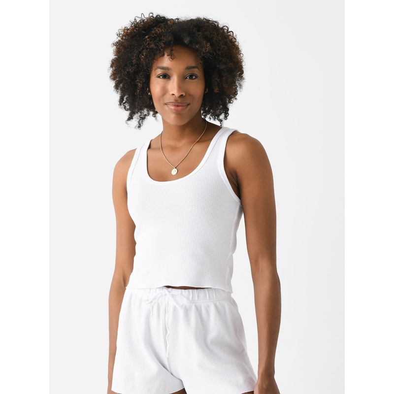 DESCRIPTION:A basic tank made from soft waffle-knit cotton fabric.FEATURES:Scoop NecklineWide StrapsSlight Cropped SilhouetteWaffle Knit Fabrication100% CottonSlim FitModel is wearing size Small tank.Model's Measurements: Height: 5'10" | Bust: 34B | Waist: