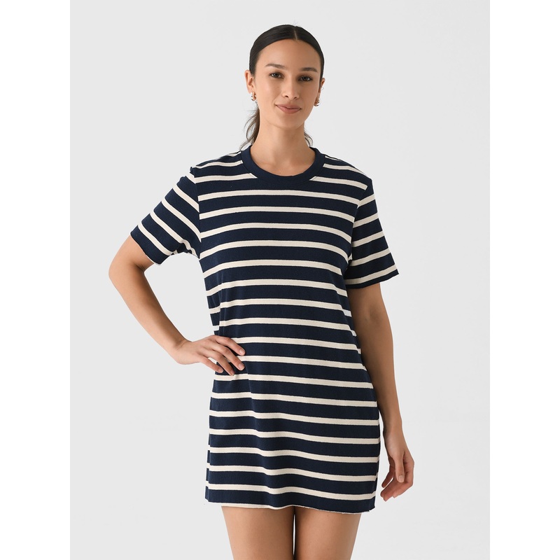 DESCRIPTION:A casual t-shirt-style dress designed for an effortless throw-on-and-go style.FEATURES:Crew NecklineShort SleevesMini SilhouetteAll-Over Stripe Print97% Recycled Cotton, 3% SpandexClassic FitModel is wearing size Small dress.Model's Measurement