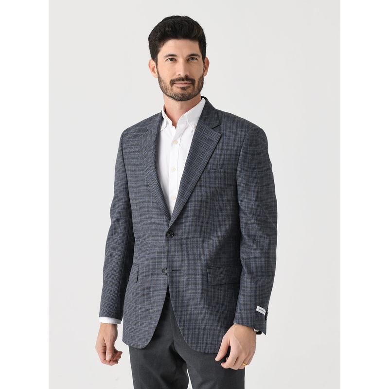 A classic, single-breasted sport coat made from brushed wool with a subtle plaid print and partial lining.