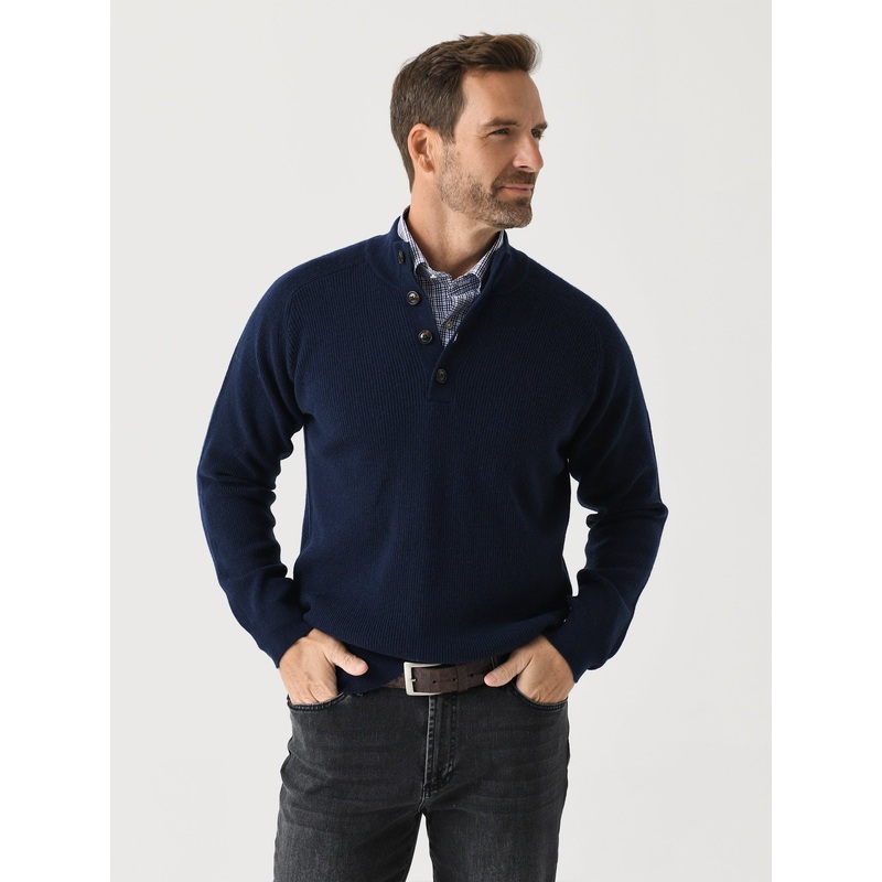 DESCRIPTION:A mock-neck pullover made from a soft blend of ribbed knit wool and cashmere with a four-button placket.FEATURES:Mock Neckline4-Button PlacketBanded Cuffs and HemRibbed Knit Fabrication90% Wool, 10% CashmereClassic FitModel is wearing size Medi