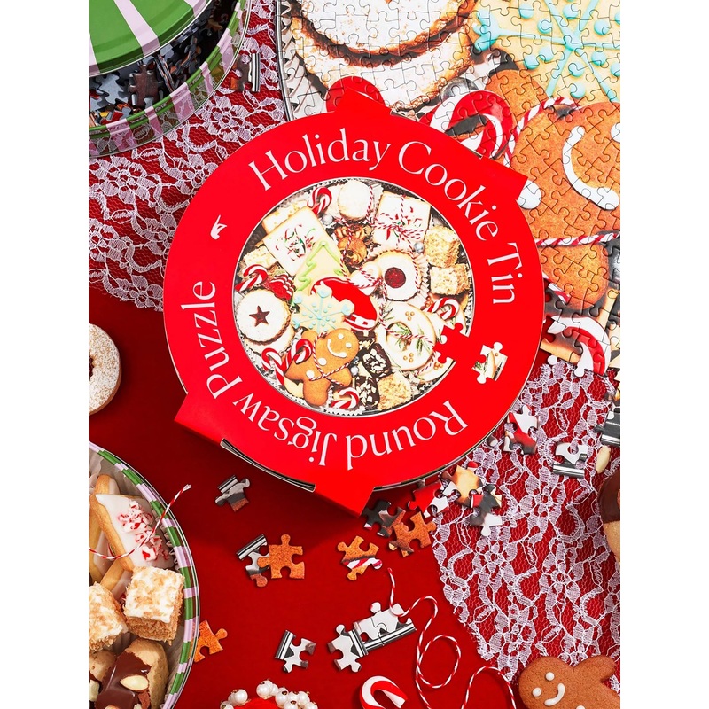 DESCRIPTION:A round jigsaw puzzle made from recycled paper with a festive holiday cookie design.