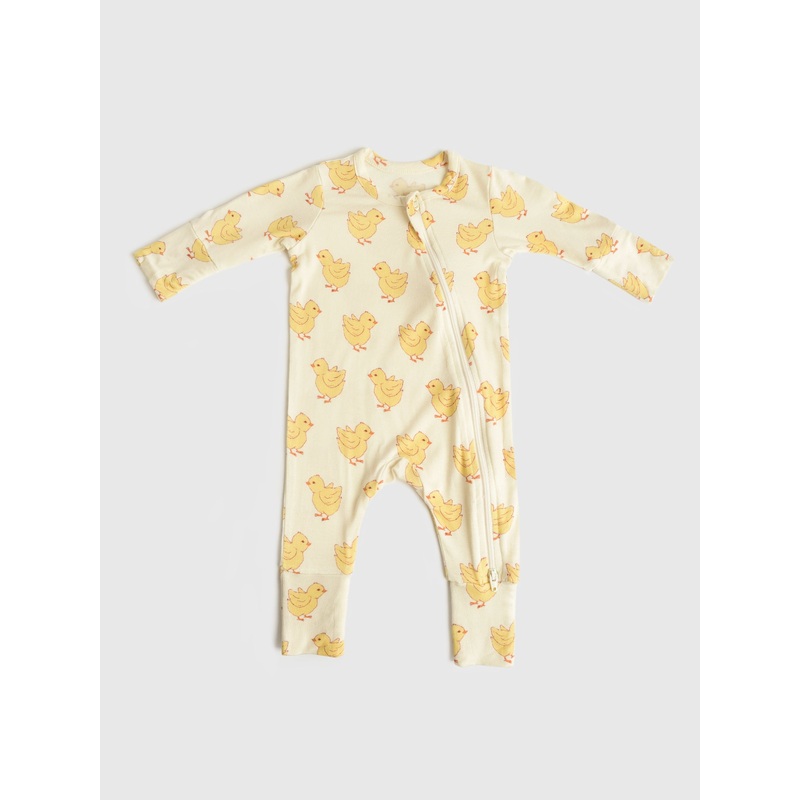 DESCRIPTION:An incredibly soft onesie made from bamboo fabric with a custom baby chick print.FEATURES:Round NecklineTwo-Way Zip ClosureBanded CuffsAll-Over Novelty Print95% Bamboo, 5% SpandexClassic Fit* Sizes 0/3 & 3/6 have fold-over hand & foot cuffs.