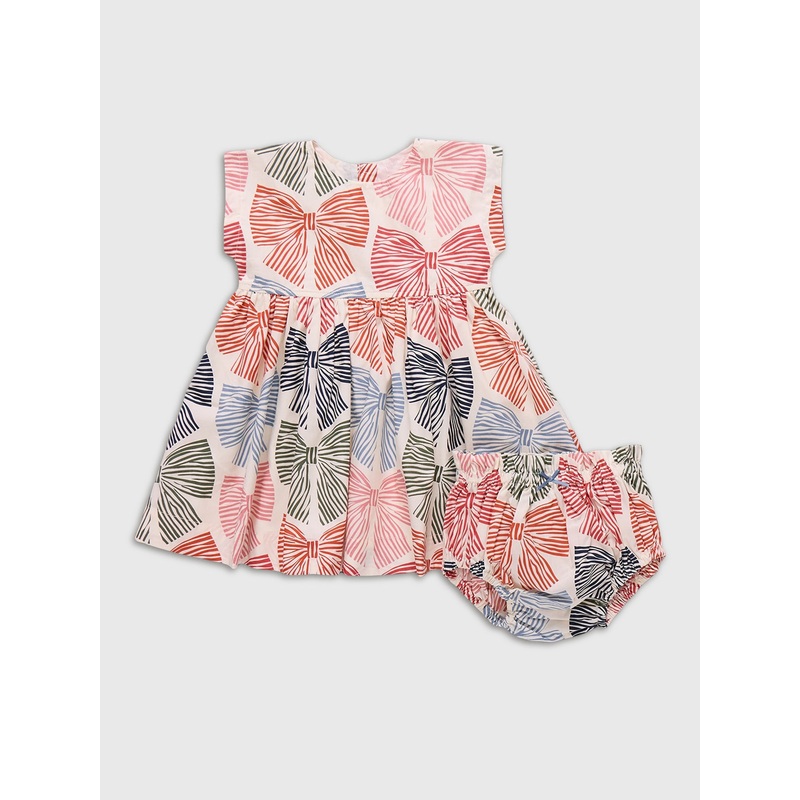 DESCRIPTION:This adorable dress and diaper cover set is made from soft cotton fabric with a colorful bows print. It features sweet cap sleeves and a gathered skirt, and is finished with glitter buttons on the back for a touch of sparkle. FEATURES:Round Nec