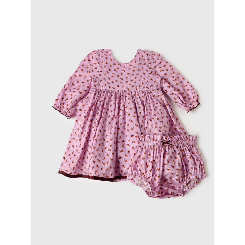 This charming dress set features burgundy ruffle cuffs, a gathered skirt with a satin ribbon trim, and shimmering silver thread. The matching diaper cover completes this adorable ensemble.