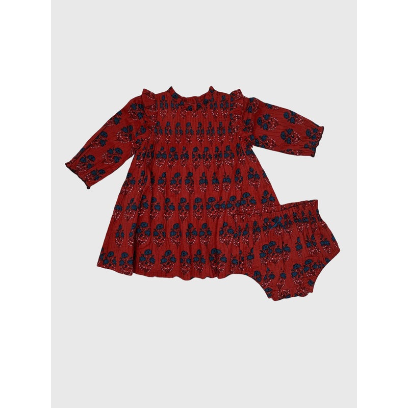 DESCRIPTION:This boho-inspired dress and diaper cover set features a ruffle neck and a pintuck bodice. A shimmery bronze pinstripe and a collection of maroon glitter buttons add a touch of sparkle.FEATURES:Round NecklineBack Button ClosurePintucked Details