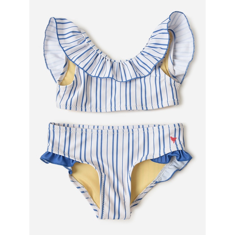 DESCRIPTION:A blue and white striped bikini set with sweet ruffle details.