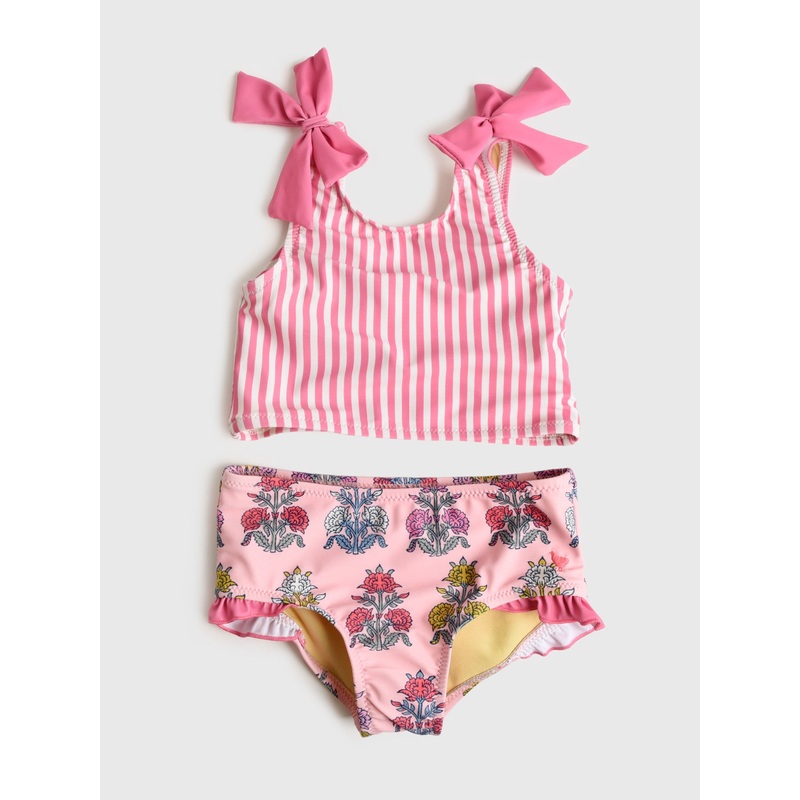 This adorable two-piece tankini features a striped top with shoulder ties and floral-print ruffle bottoms.
