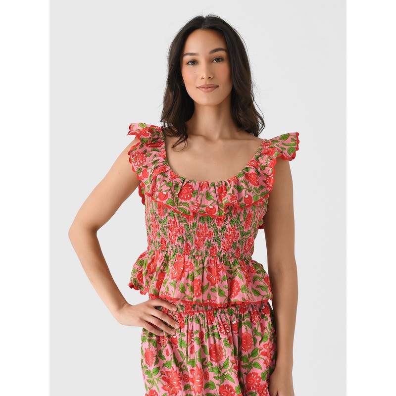 DESCRIPTION:This sweet and simple design features a screen-printed pattern on organic cotton. The flattering scoop neckline and cute bow detail at the back add a touch of playfulness.FEATURES:Scoop NecklineRuffle TrimBack Tie ClosureSmocked BodicePeplum He