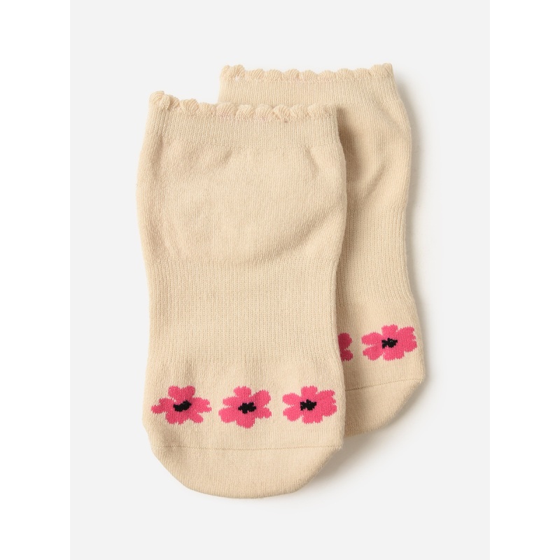 A pair of cushioned grip socks with a ruffle trim and floral design.