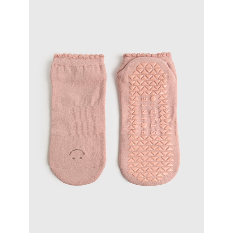 DESCRIPTION:Ankle-length grip socks with an embroidered smile design.FEATURES:SocksAnkle LengthPadded Ankle RestCompression Arch SupportMid-Weight Terry FootbedPVC Grip Bottom55% Cotton, 40% Nylon, 5% SpandexS/M Fits Women's Size 5 - 7.5M/L Fits Women's Si