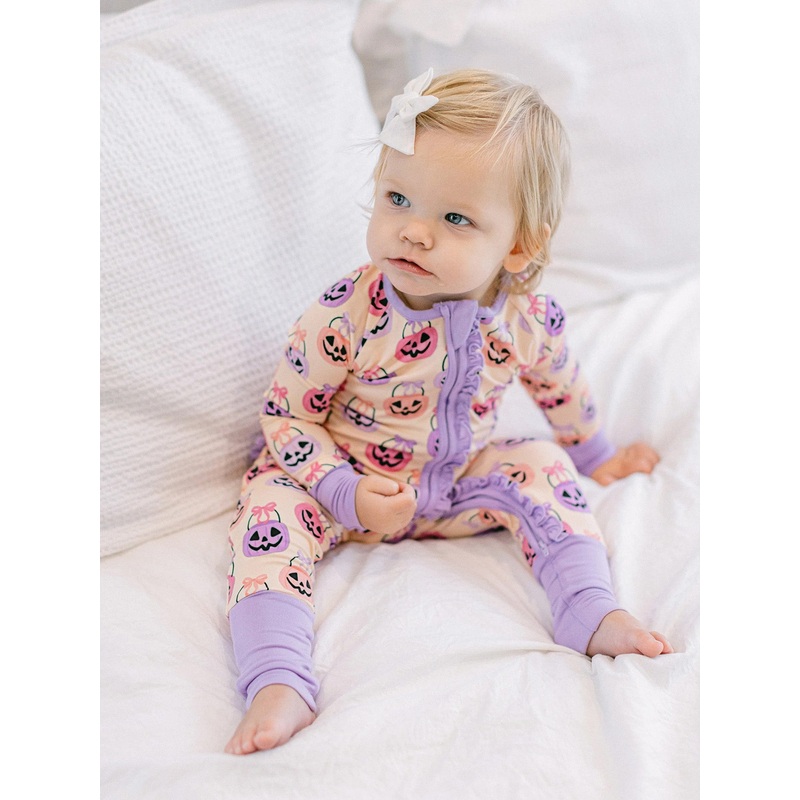 DESCRIPTION:This soft and cozy romper is made from stretchy bamboo viscose fabric and features sweet ruffle trims, a convenient two-way zipper, and a playful Halloween bucket print. Perfect for spooky season snuggles, it's as cute as it is comfy.FEATURES:R