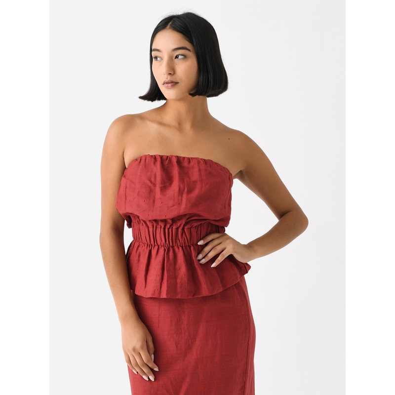A gathered strapless top made from soft embroidered ramie fabric with a chic peplum hem and cinched waist.